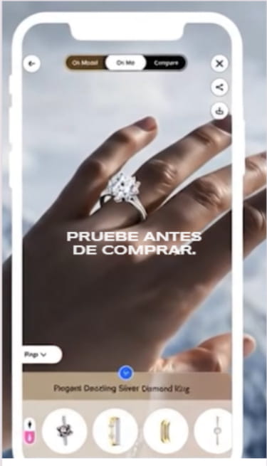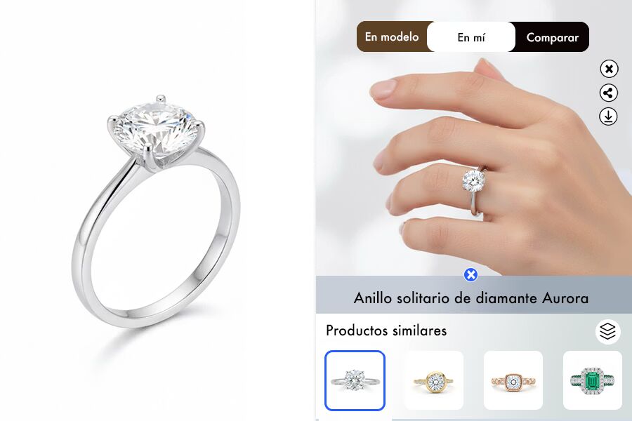 Permite a los clientes probarse varias joyas a la vez, como varios anillos, con un botón para añadirlas directamente al carrito y comprar al instante. Permite a los clientes cambiar el tono de piel de la modelo y ajustar la posición de las joyas mientras se las prueban.