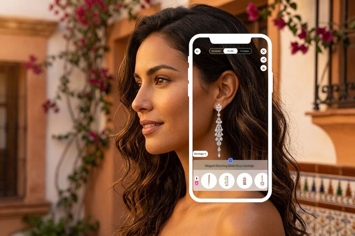 Nuestra solución de prueba virtual toma una foto tuya y luego te coloca la joya correspondiente. iAugment primero usa la cámara de tu móvil para capturar tu imagen, y luego el motor de IA ajusta el artículo perfectamente en la imagen capturada para obtener el resultado más preciso.